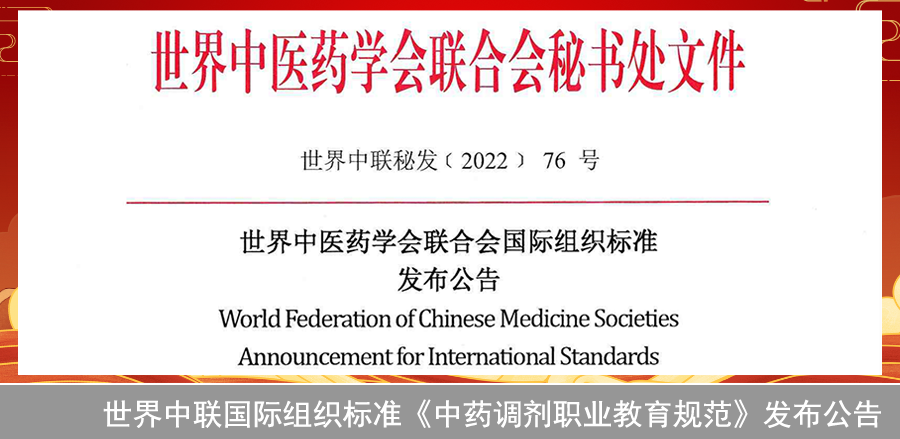 2022年10月29日,世界中醫(yī)藥學(xué)會(huì)聯(lián)合會(huì)秘書處發(fā)布文件,批準(zhǔn)《中藥調(diào)劑職業(yè)教育規(guī)范》(SCM 72-2022)發(fā)布,并進(jìn)行公告。