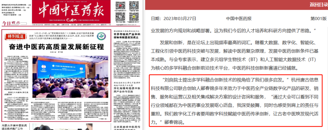 唐古受邀參加中國中醫(yī)藥高質(zhì)量發(fā)展大會,展示中醫(yī)藥數(shù)字化解決方案發(fā)表時間:2023-03-29 09:23 3月22-23日,中國中醫(yī)藥高質(zhì)量發(fā)展大會在深圳隆重舉行。國家衛(wèi)生健康委黨組成員、國家中醫(yī)藥管理局黨組書記余艷紅,廣東省委常委、副省長王曦出席開幕式并致辭。作為中國中醫(yī)藥報宣傳聯(lián)盟單位,杭州唐古信息科技有限公司受邀,攜中醫(yī)藥產(chǎn)業(yè)數(shù)字化解決方案亮相大會。 ![]() 大會上,作為首批國家中醫(yī)藥綜合改革示范區(qū)的上海、浙江、江西、山東、廣東、四川等省市的代表,共同圍繞“推進國家中醫(yī)藥綜合改革示范區(qū)建設,激發(fā)高質(zhì)量發(fā)展活力”這一主題進行發(fā)言。兩地代表分別匯報了“上海中藥云”和“中醫(yī)處方一件事數(shù)字化改革”項目。唐古信息均參與建設了這兩大重要項目。 ![]() 上海市中醫(yī)藥管理局副局長胡鴻毅作《制度創(chuàng)新,多方聯(lián)動,構建中醫(yī)藥高質(zhì)量發(fā)展大格局》專題匯報。他介紹了黃浦區(qū)先行探索智慧中藥云、曙光醫(yī)院探索區(qū)塊鏈+中藥代煎、建立中藥飲片溯源體系及優(yōu)質(zhì)優(yōu)價政策支持三個先行試點,表示“上海中藥云”平臺通過多跨應用場景建設,實現(xiàn)與市級醫(yī)院中藥云、16個區(qū)“實體云”或“虛擬云”的數(shù)據(jù)對接,探索飲片藥事管理新模式。 ![]() 浙江省中醫(yī)藥管理局副局長曹啟峰作《以中醫(yī)藥綜合改革示范區(qū)建設為契機,加快推進浙江中醫(yī)藥高質(zhì)量發(fā)展》專題匯報。他表示浙江省通過深化“中醫(yī)處方一件事”改革,打造“一張?zhí)幏?,四大功能”。一是“智醫(yī)”,通過信息化,讓四診信息有據(jù)可查;二是“智藥”,通過處方進行質(zhì)量追溯體系;三是“智治”,根據(jù)處方數(shù)據(jù)對醫(yī)院績效進行治理;四是“智研”,通過臨床科研一體化,更好地進行大數(shù)據(jù)的研究。 作為中醫(yī)藥產(chǎn)業(yè)數(shù)字化排頭兵,唐古信息很榮幸能夠參與兩大國家中醫(yī)藥綜合改革示范建設的先行先試工作中,并且借大會之機與其他省份的衛(wèi)健委、醫(yī)療機構、中醫(yī)院校和行業(yè)同仁交流分享中醫(yī)藥數(shù)字化建設經(jīng)驗。 《中國中醫(yī)藥報》在此次大會的特別報道中,采訪了唐古信息聯(lián)合創(chuàng)始人酈春錦。他表示通過大會看到不同行業(yè)領域都在為中醫(yī)藥事業(yè)發(fā)展嘔心瀝血,深受鼓舞之余,更覺肩上的任務與重擔。作為數(shù)字化工作者,將以數(shù)字科技賦能中醫(yī)藥傳承創(chuàng)新,讓古老中醫(yī)煥發(fā)現(xiàn)代活力。 ![]() |