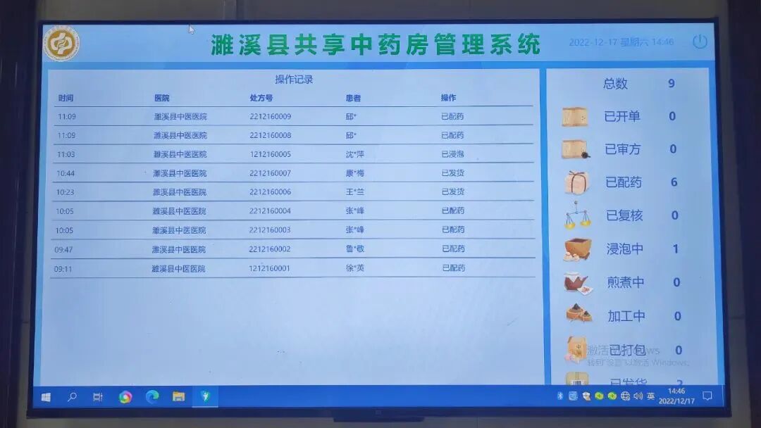 2022年5月,濉溪縣共享智慧中藥房管理系統(tǒng)上線,在縣中醫(yī)醫(yī)院醫(yī)共體6家衛(wèi)生院開展在線開藥配送服務(wù)試點。2022年9月,擴大至全縣18家衛(wèi)生院。同時通過組織多輪培訓(xùn),使基層中醫(yī)師、中藥調(diào)劑人員熟練掌握系統(tǒng)操作使用。自上線以來,共調(diào)配處方9000余張。