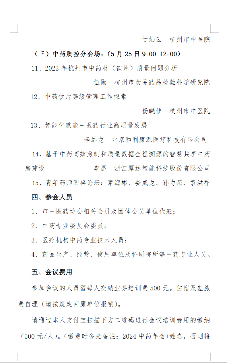 會(huì)議培訓(xùn)費(fèi)500元/人。請(qǐng)通過支付寶掃描下方二維碼繳費(fèi),繳費(fèi)時(shí)務(wù)必備注“2024 中藥年會(huì)+姓名”,否則將無法識(shí)別。