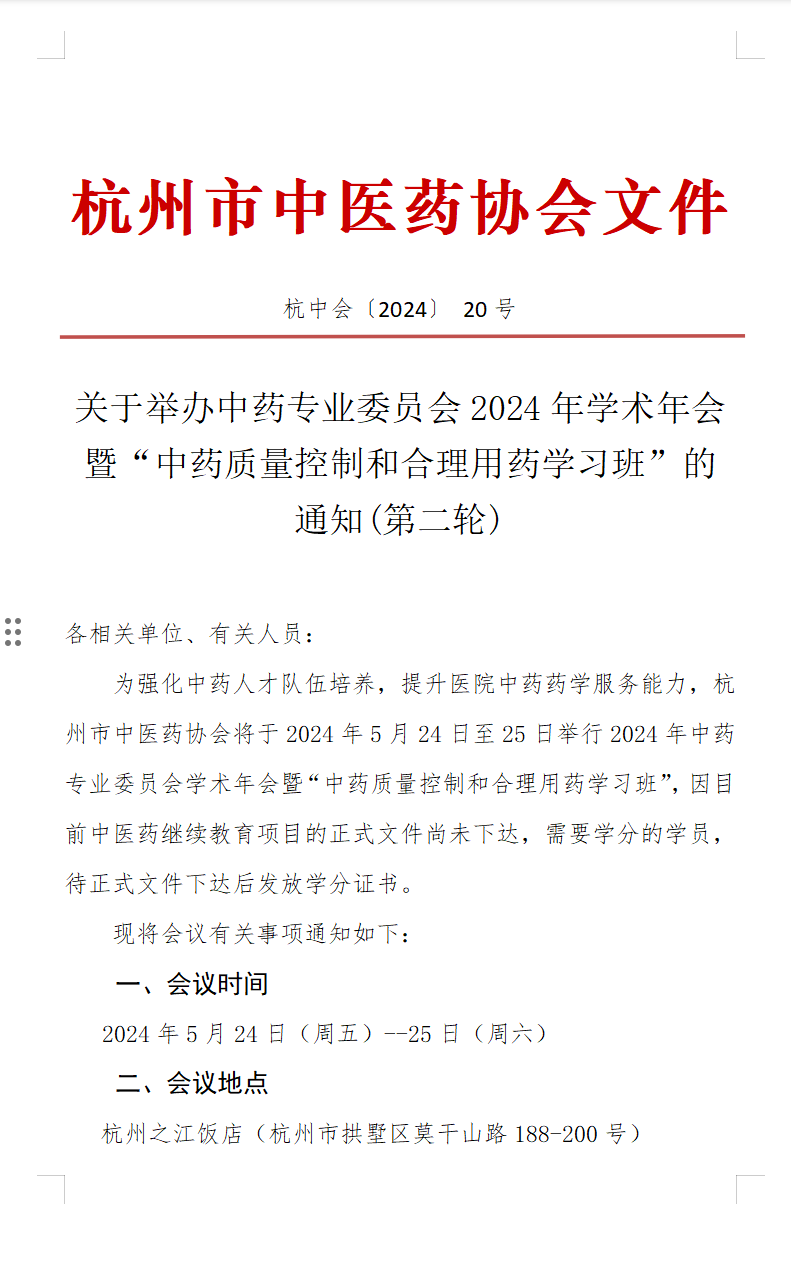 杭州市中醫(yī)藥協(xié)會(huì)中藥專委會(huì)2024 年學(xué)術(shù)年會(huì)暨中藥質(zhì)量控制和合理用藥學(xué)習(xí)班會(huì)議第二輪通知