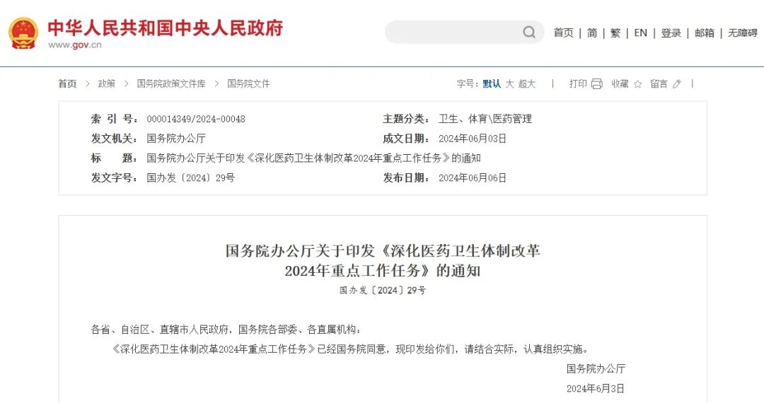 國務(wù)院辦公廳印發(fā)《深化醫(yī)藥衛(wèi)生體制改革2024年重點(diǎn)工作任務(wù)》